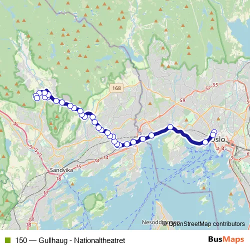 The first stop of the 150 bus route is Holbergs plass and the last stop is Gullhaug. 150 (Gullhaug - Nationaltheatret) is operational during everyday.