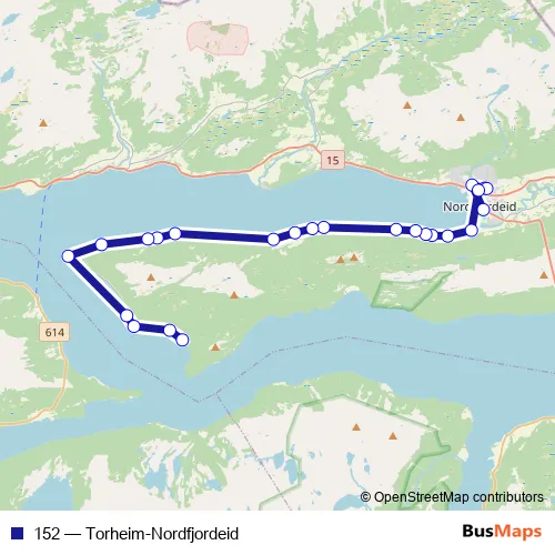 The first stop of the 152 bus route is Nordfjordeid rutebilstasjon and the last stop is Torheim. 152 (Torheim-Nordfjordeid) is operational during on weekdays.