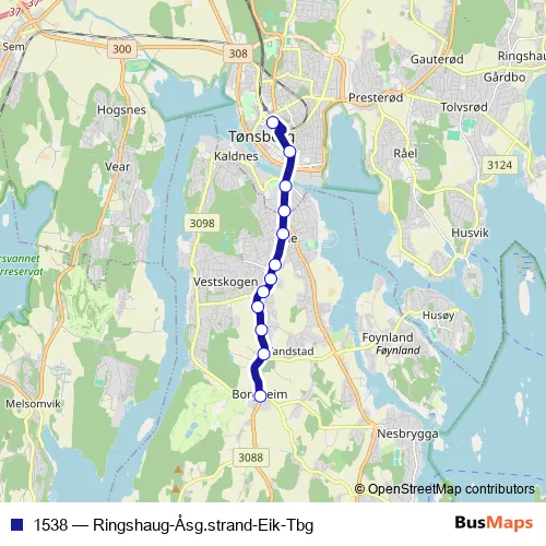 The first stop of the 1538 bus route is Ringshaug ungdomsskole and the last stop is Klokkeråsen. 1538 (Ringshaug-Åsg.strand-Eik-Tbg) is operational during everyday.