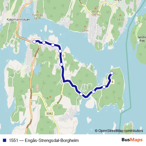 The first stop of the 1551 bus route is Borgheim and the last stop is Steinerskolen i Vestfold. 1551 (Engås-Strengsdal-Borgheim) is operational during on weekdays.