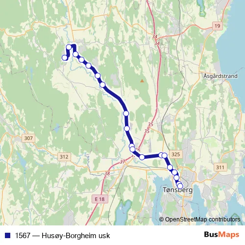 The first stop of the 1567 bus route is Bergsåsen and the last stop is Tønsberg rutebilstasjon. 1567 (Husøy-Borgheim usk) is operational during on weekdays.
