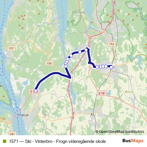 The first stop of the 1571 bus route is Frogn videregående skole and the last stop is Ski stasjon Jernbaneveien. 1571 (Ski - Vinterbro - Frogn videregående skole) is operational during on weekdays.