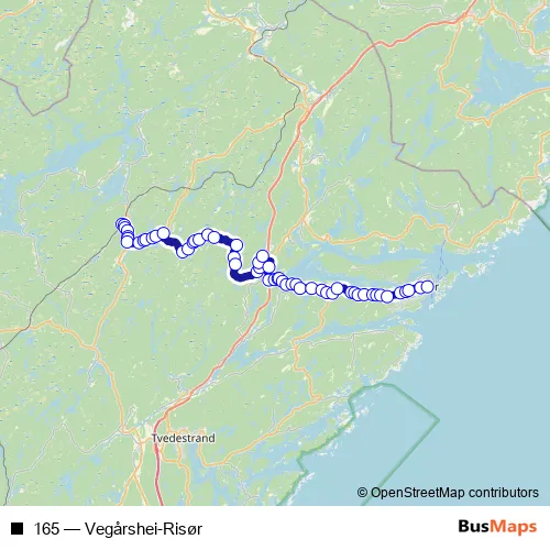 The first stop of the 165 bus route is Vegårshei stasjon and the last stop is Risør Tollboden. 165 (Vegårshei-Risør) is operational during on weekdays.
