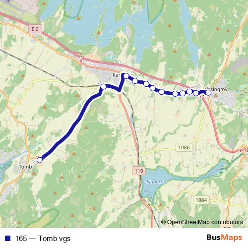 The first stop of the 165 bus route is Tomb vgs. and the last stop is Missingmyr. 165 (Tomb vgs) is operational during on weekdays.