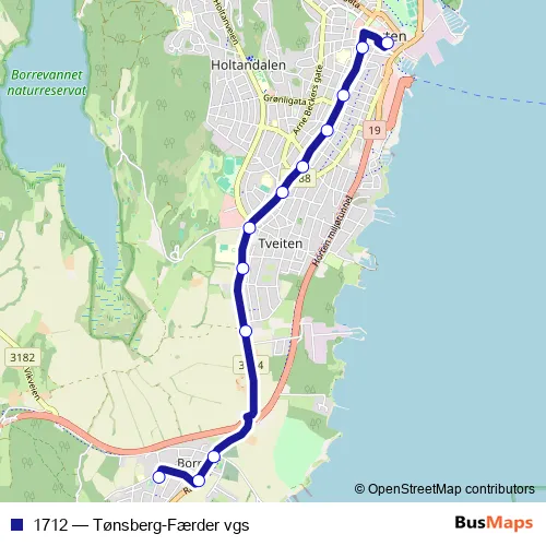 The first stop of the 1712 bus route is Tønsberg rutebilstasjon and the last stop is Færder vgs.. 1712 (Tønsberg-Færder vgs) is operational during on weekdays.