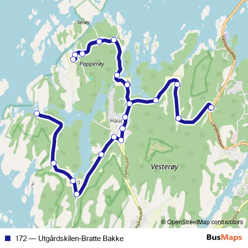 The first stop of the 172 bus route is Bratte Bakke and the last stop is Papperhavn. 172 (Utgårdskilen-Bratte Bakke) is operational during on weekdays.