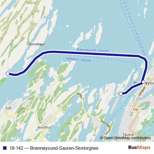 The first stop of the 18-142 ferry route is Sauren ferjekai and the last stop is Hestøya ferjekai. 18-142 (Brønnøysund-Sauren-Stortorgnes) is operational during everyday.