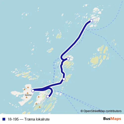 The first stop of the 18-195 ferry route is Selvær hurtigbåtkai and the last stop is Træna hurtigbåtkai. 18-195 (Træna lokalrute) is operational during everyday.