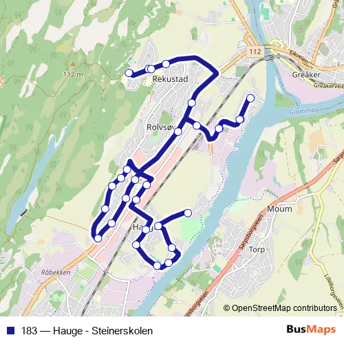 The first stop of the 183 bus route is Omberg and the last stop is Steinerskolen Fredrikstad. 183 (Hauge - Steinerskolen) is operational during on weekdays.
