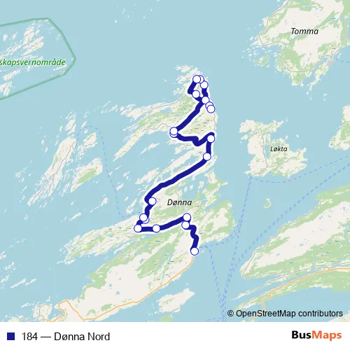 The first stop of the 184 bus route is Bjørn kai and the last stop is Åkvik nord. 184 (Dønna Nord) is operational during everyday.