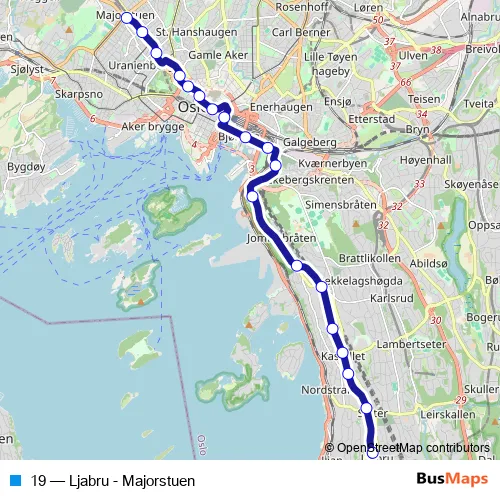 The first stop of the 19 tram route is Majorstuen and the last stop is Ljabru. 19 (Ljabru - Majorstuen) is operational during everyday.