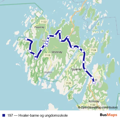 The first stop of the 197 bus route is Hvaler ungdomsskole and the last stop is Papperhavn. 197 (Hvaler-barne og ungdomsskole) is operational during on weekdays.