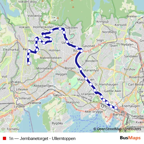 The first stop of the 1n bus route is Ullerntoppen and the last stop is Jernbanetorget. 1n (Jernbanetorget - Ullerntoppen) is operational during on weekends.