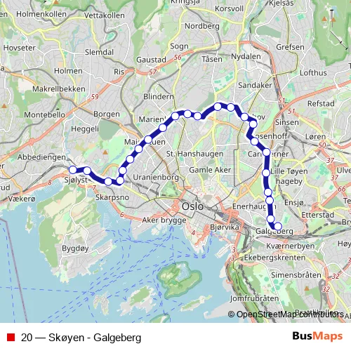 The first stop of the 20 bus route is Skøyen stasjon and the last stop is Galgeberg. 20 (Skøyen - Galgeberg) is operational during everyday.
