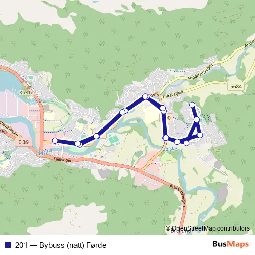 The first stop of the 201 bus route is Førde rutebilstasjon and the last stop is Førde rutebilstasjon. 201 (Bybuss (natt) Førde) is operational during everyday.