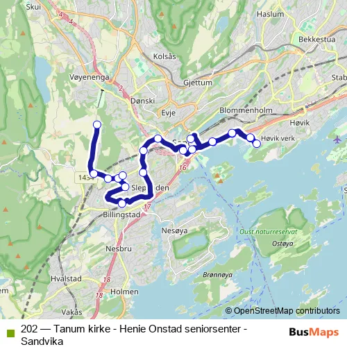 The first stop of the 202 bus route is Tanum kirke and the last stop is Sandvika bussterminal. 202 (Tanum kirke - Henie Onstad seniorsenter - Sandvika) is operational during on weekdays.