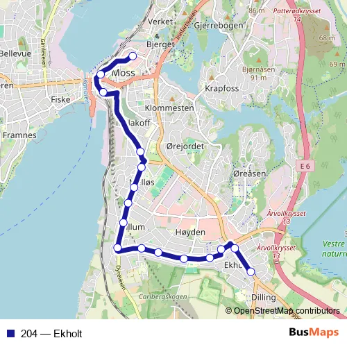 The first stop of the 204 bus route is Bredsand and the last stop is Moss bussterminal. 204 (Ekholt) is operational during on weekdays.