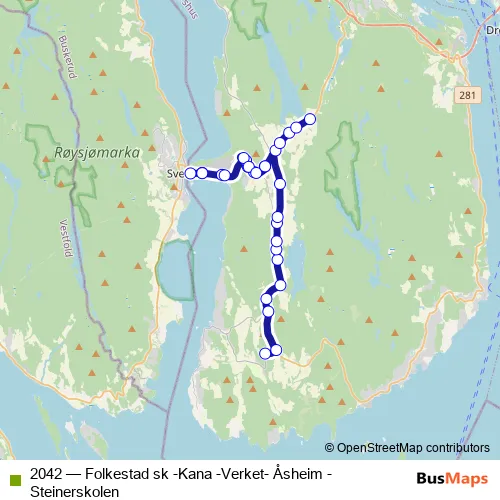 The first stop of the 2042 bus route is Folkestad skole and the last stop is Steinerskolen Hurum. 2042 (Folkestad sk -Kana -Verket- Åsheim -Steinerskolen) is operational during on weekdays.