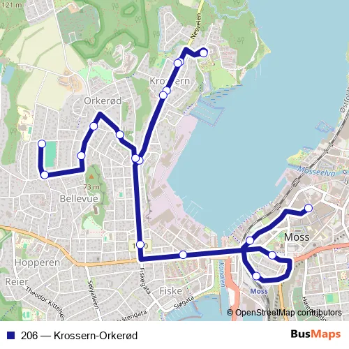 The first stop of the 206 bus route is Moss bussterminal and the last stop is Orkerød. 206 (Krossern-Orkerød) is operational during on weekdays.