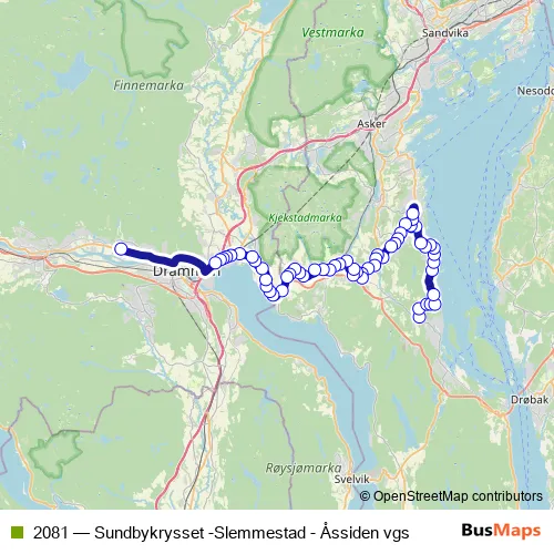 The first stop of the 2081 bus route is Sundbykrysset and the last stop is Liejordet. 2081 (Sundbykrysset -Slemmestad - Åssiden vgs) is operational during on weekdays.