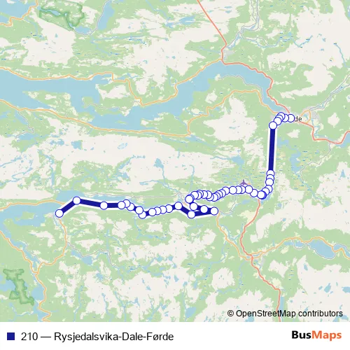 The first stop of the 210 bus route is Førde rutebilstasjon and the last stop is Dale. 210 (Rysjedalsvika-Dale-Førde) is operational during everyday.