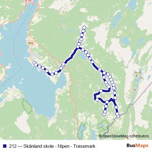 The first stop of the 212 bus route is Skånland sentralskole and the last stop is Vatnlia. 212 (Skånland skole - Nipen - Trøsemark) is operational during on weekdays.