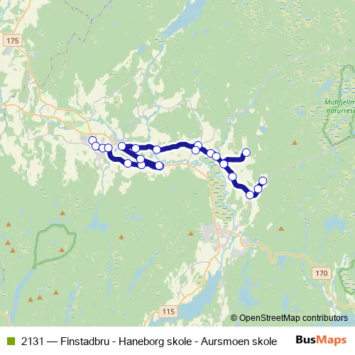 The first stop of the 2131 bus route is Aursmoen skole and the last stop is Haneborg skole. 2131 (Finstadbru - Haneborg skole - Aursmoen skole) is operational during on weekdays.