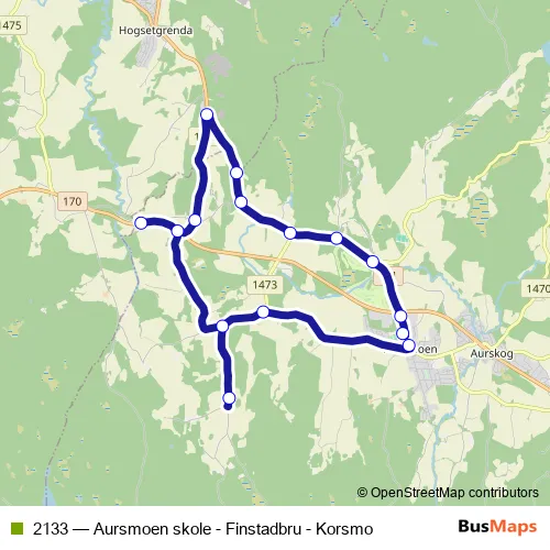 The first stop of the 2133 bus route is Aursmoen skole and the last stop is Aursmoen. 2133 (Aursmoen skole - Finstadbru - Korsmo) is operational during everyday.