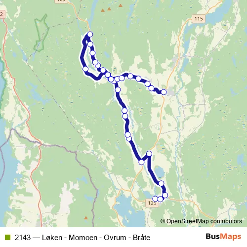 The first stop of the 2143 bus route is Bråte skole and the last stop is Løken. 2143 (Løken - Momoen - Ovrum - Bråte) is operational during on weekdays.