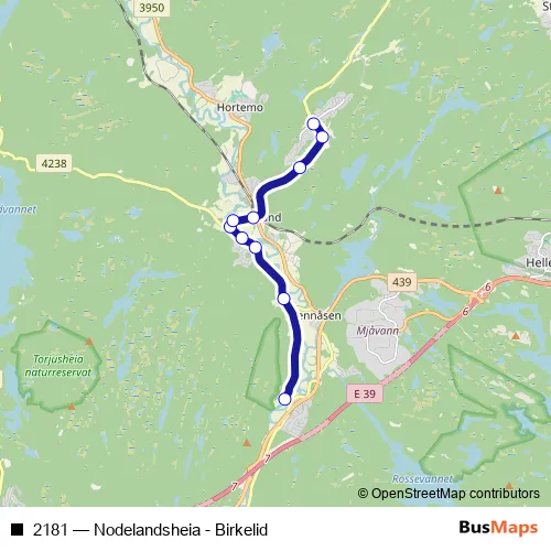 The first stop of the 2181 bus route is Birkelid and the last stop is Nodelandsheia. 2181 (Nodelandsheia - Birkelid) is operational during on weekdays.