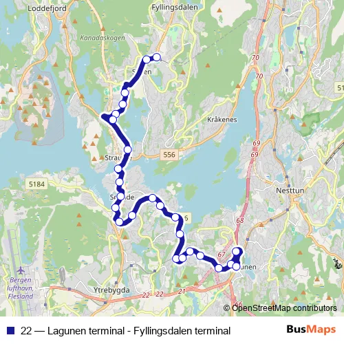 The first stop of the 22 bus route is Fyllingsdalen terminal and the last stop is Lagunen terminal. 22 (Lagunen terminal - Fyllingsdalen terminal) is operational during everyday.