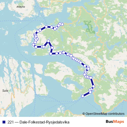 The first stop of the 221 bus route is Sørbøvåg and the last stop is Leirvik. 221 (Dale-Folkestad-Rysjedalsvika) is operational during everyday.