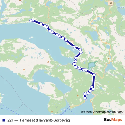 The first stop of the 221 bus route is Tjørneset and the last stop is Sørbøvåg. 221 (Tjørneset (Havyard)-Sørbøvåg) is operational during on weekdays.