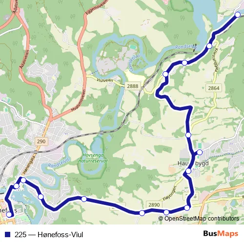 The first stop of the 225 bus route is Hønefoss sentrum and the last stop is Viul bru. 225 (Hønefoss-Viul) is operational during on weekdays.