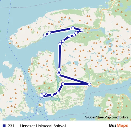 The first stop of the 231 bus route is Mjåset and the last stop is Askvoll skule. 231 (Unneset-Holmedal-Askvoll) is operational during on weekdays.