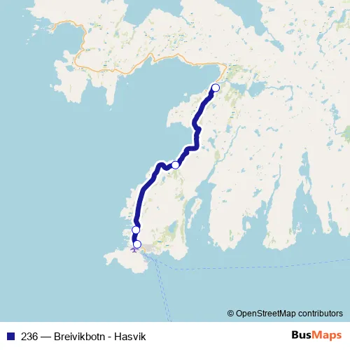 The first stop of the 236 bus route is Breivikbotn skole and the last stop is Flyplasskrysset Hasvik. 236 (Breivikbotn - Hasvik) is operational during on weekdays.