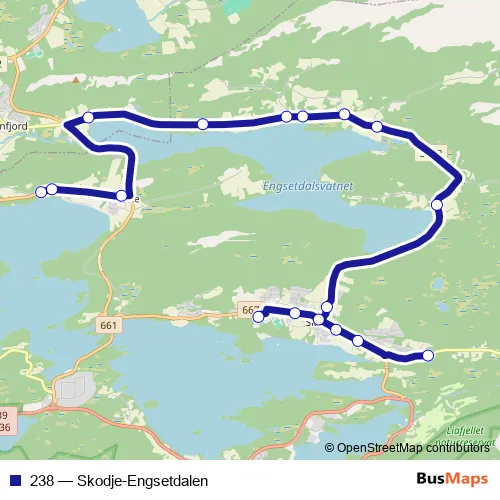 The first stop of the 238 bus route is Skodje skular and the last stop is Opskar kryss. 238 (Skodje-Engsetdalen) is operational during on weekdays.