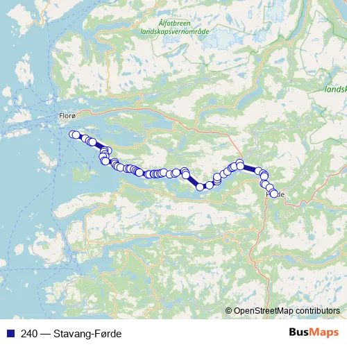 The first stop of the 240 bus route is Veiesund kai and the last stop is Førde rutebilstasjon. 240 (Stavang-Førde) is operational during on weekdays.