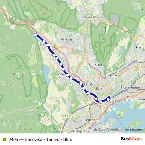 The first stop of the 240n bus route is Smestad and the last stop is Sandvika bussterminal. 240n (Sandvika - Tanum - Skui) is operational during on weekends.