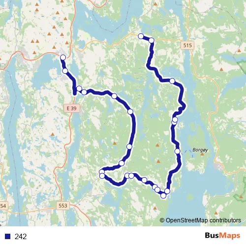 The first stop of the 242 bus route is Aksdal bussterminal and the last stop is Stakland. 242 is operational during on weekdays.