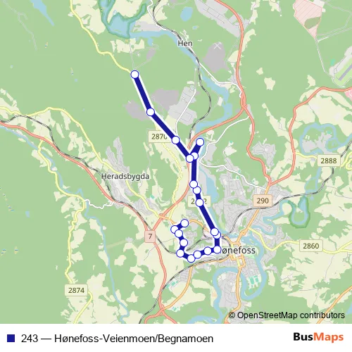 The first stop of the 243 bus route is Veien skole and the last stop is Gythemoen. 243 (Hønefoss-Veienmoen/Begnamoen) is operational during on weekdays.