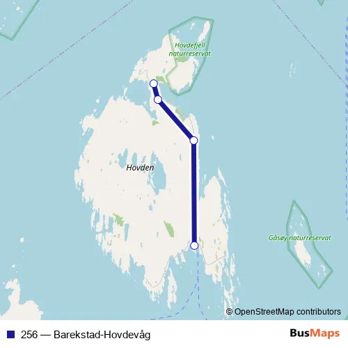 The first stop of the 256 bus route is Hovdevåg and the last stop is Barekstad kai. 256 (Barekstad-Hovdevåg) is operational during on weekdays.