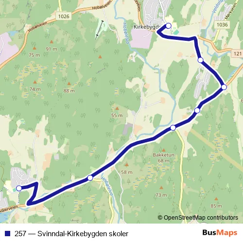 The first stop of the 257 bus route is Våk skole and the last stop is Kirkebygden skole. 257 (Svinndal-Kirkebygden skoler) is operational during on weekdays.