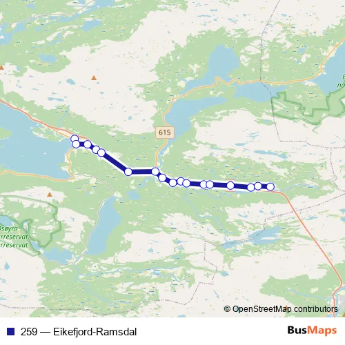 The first stop of the 259 bus route is Eikefjord barne- og ungdomsskule and the last stop is Svarthumle midtre. 259 (Eikefjord-Ramsdal) is operational during on weekdays.