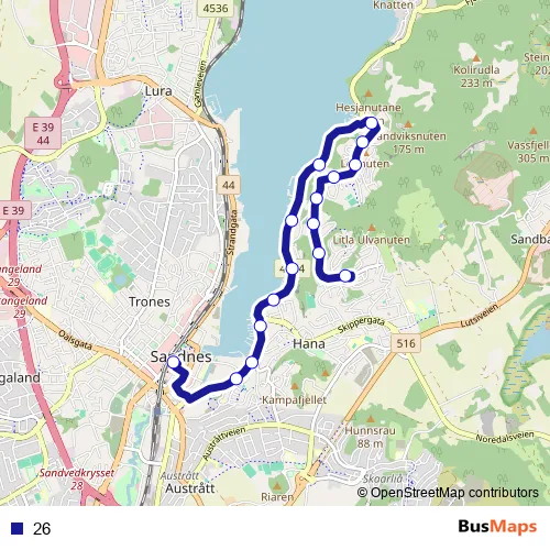 See why over 2 million users trust and consider busmaps.com as the best public transport website. busmaps gives you Sandnes Buses suggested routes, real-time bus tracker, line route maps in Sandnes, and helps to find the closest 26 bus stops near you. No internet available? Download an offline PDF map and bus schedule for the 26 bus to take on your trip.