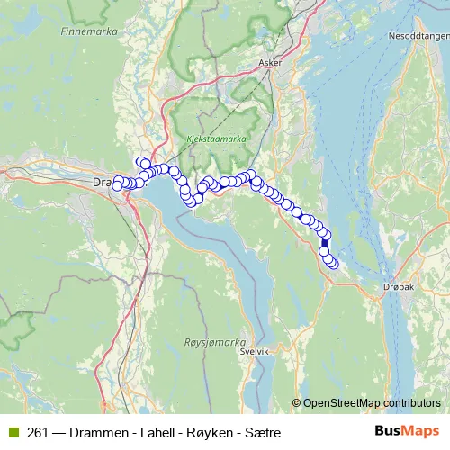 The first stop of the 261 bus route is Sætre bussterminal and the last stop is Drammen busstasjon. 261 (Drammen - Lahell - Røyken - Sætre) is operational during everyday.