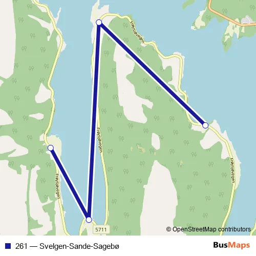 The first stop of the 261 bus route is Sagebø and the last stop is Mulelid. 261 (Svelgen-Sande-Sagebø) is operational during on weekdays.