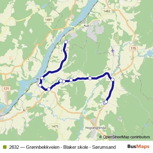 The first stop of the 2632 bus route is Blaker skole and the last stop is Grønnbekkvegen. 2632 (Grønnbekkveien - Blaker skole - Sørumsand) is operational during on weekdays.