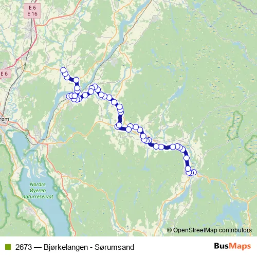 The first stop of the 2673 bus route is Bjørkelangen stasjon and the last stop is Lørenfallet. 2673 (Bjørkelangen - Sørumsand) is operational during on weekdays.