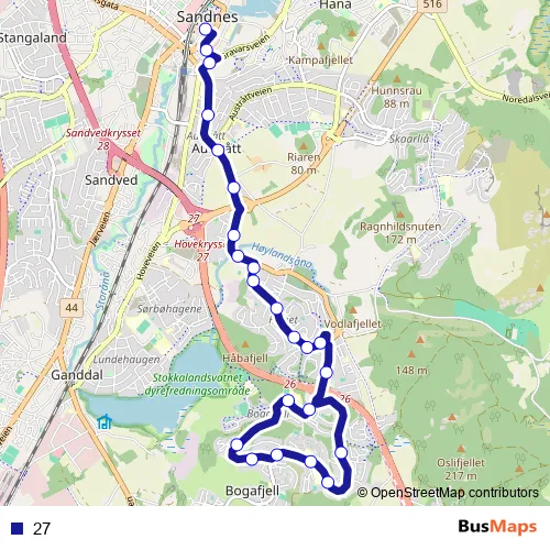 The first stop of the 27 bus route is Bogafjellveien sør and the last stop is Sandnes bussterminal Ruten. 27 is operational during everyday.